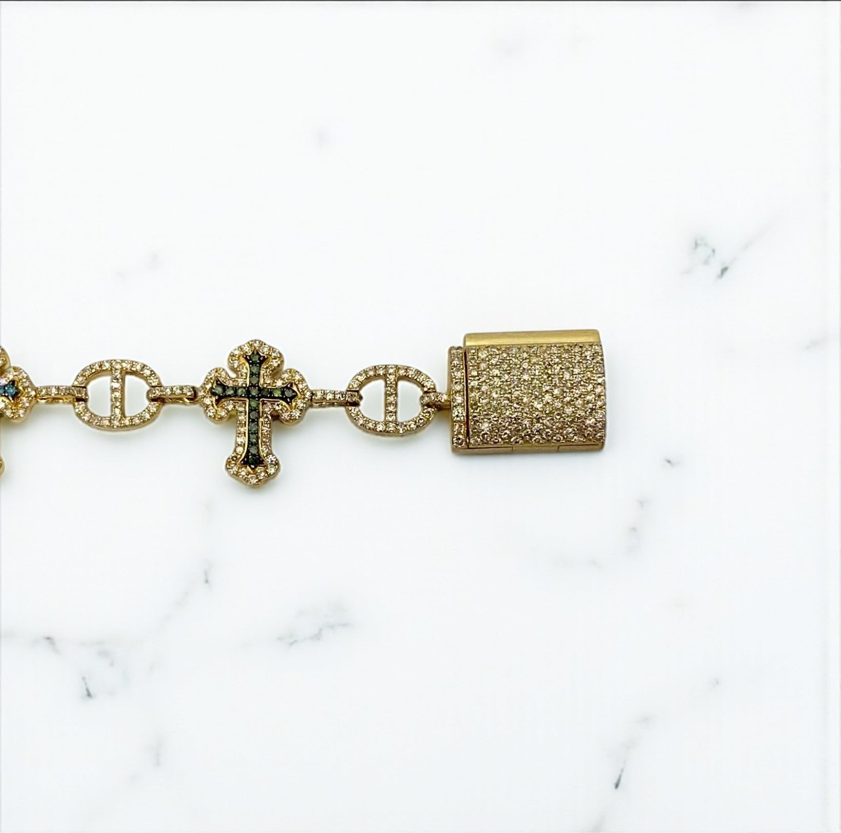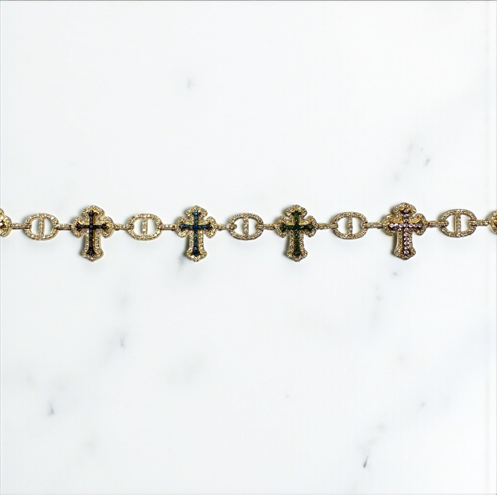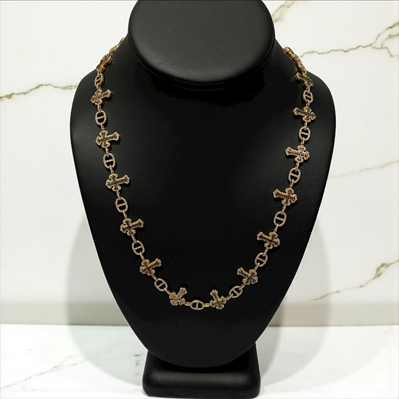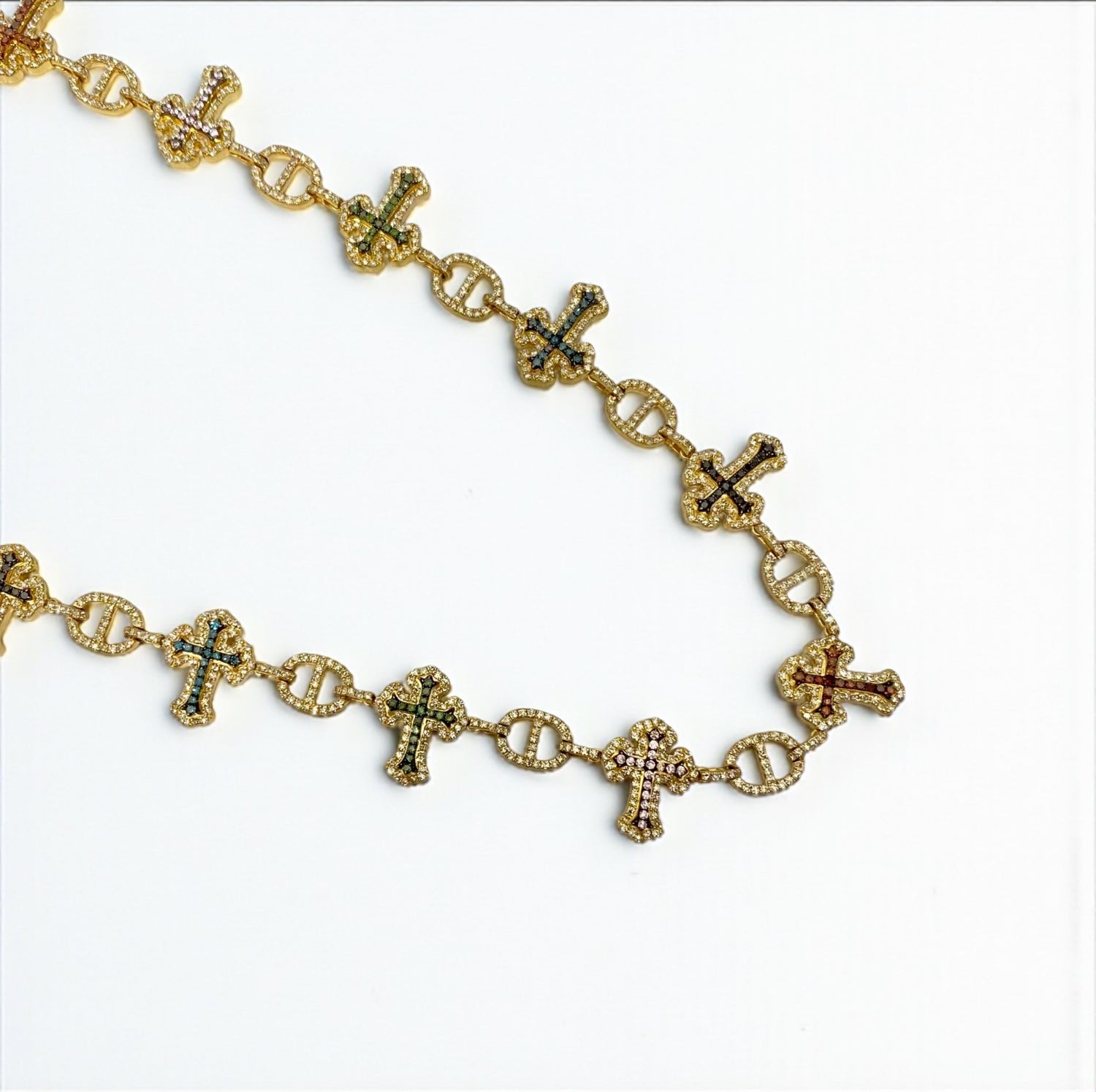 10K Yellow Gold Diamond Crosses Multicolor Chain 7.96Ct Lab Dia / 45gr / 7mm / 22in