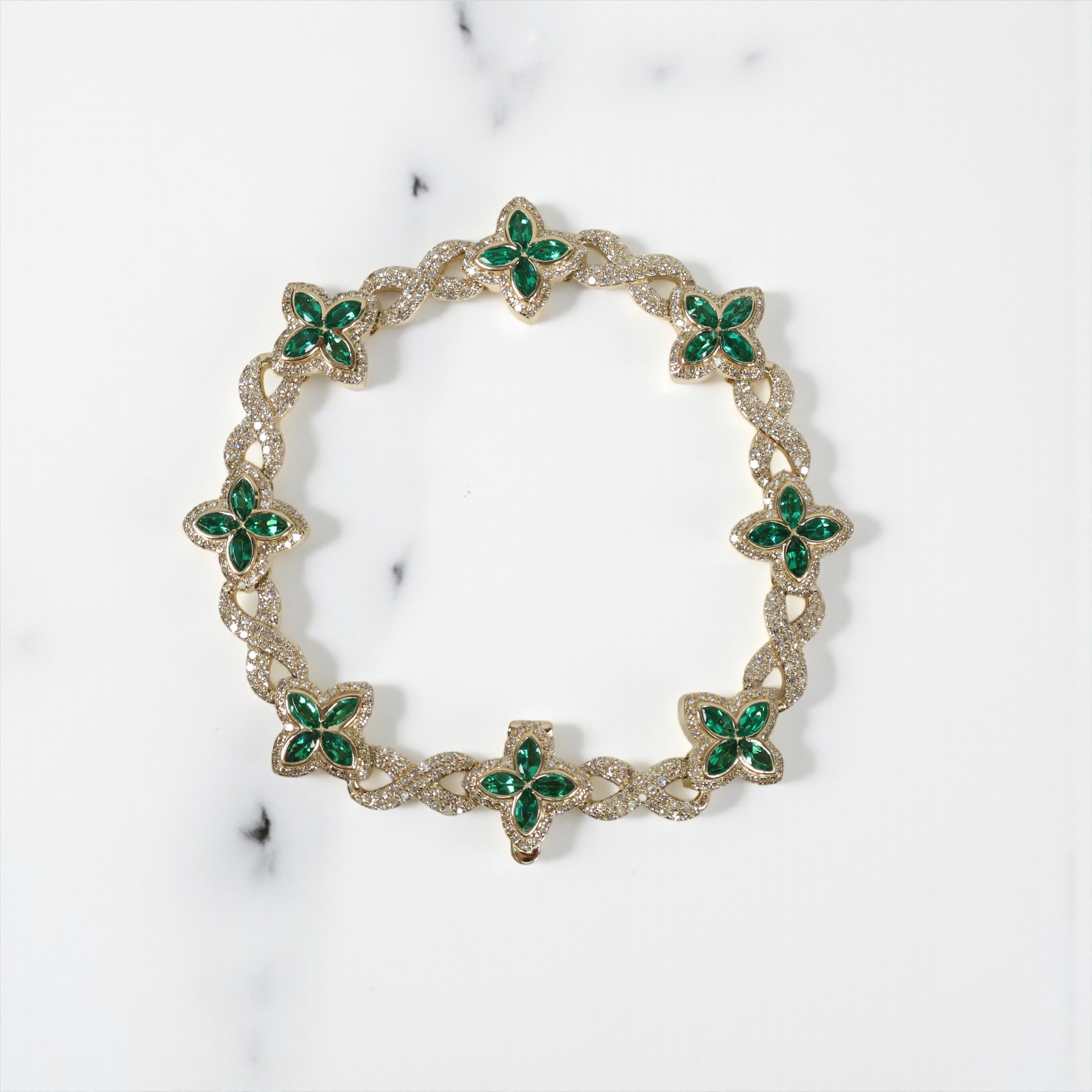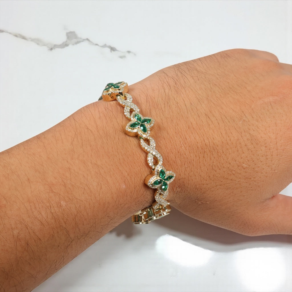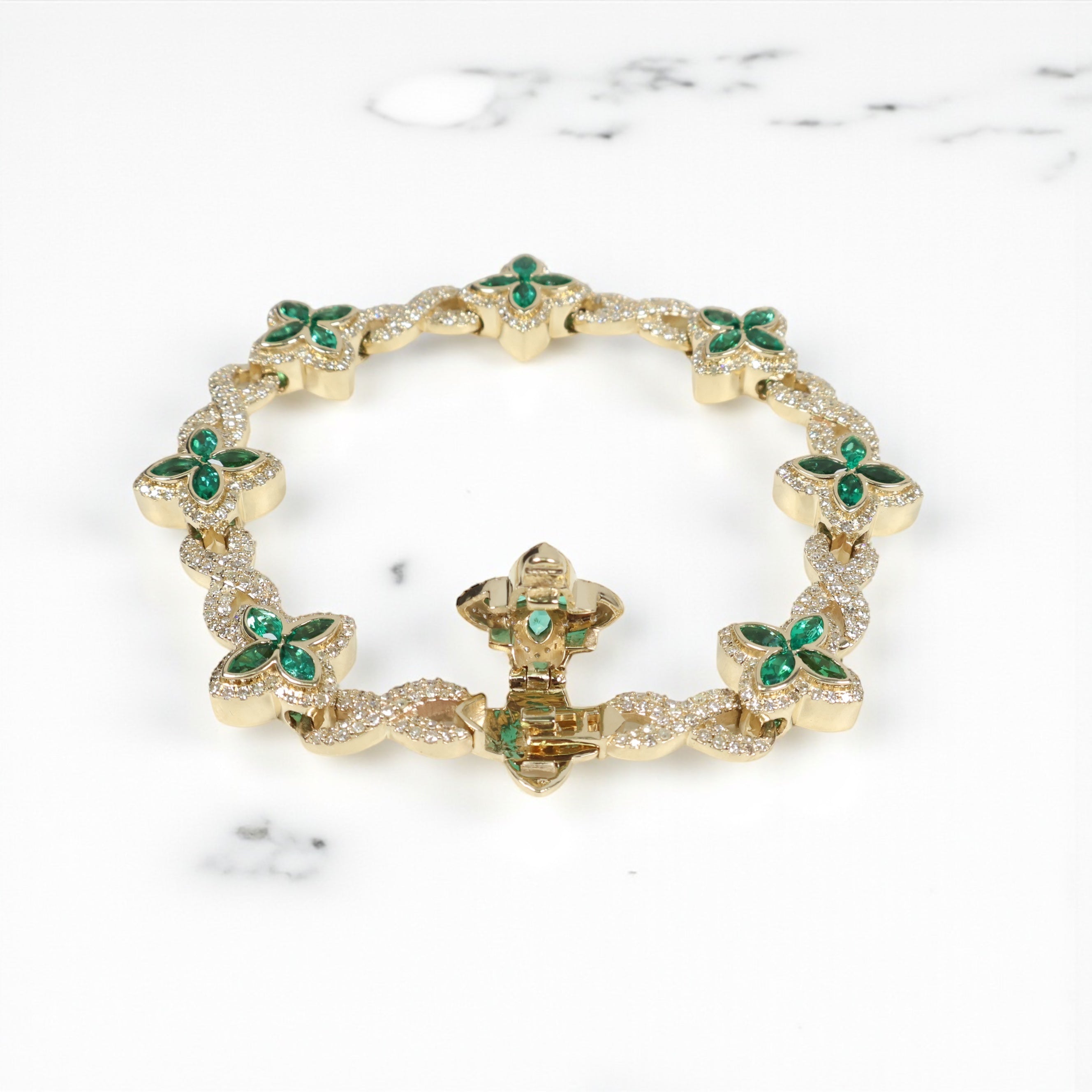 10K YG Diamond Clover With Emerald Bracelet / 32gr / 14mm / 8in / Eme-4.45Ct / D-3.65Ct