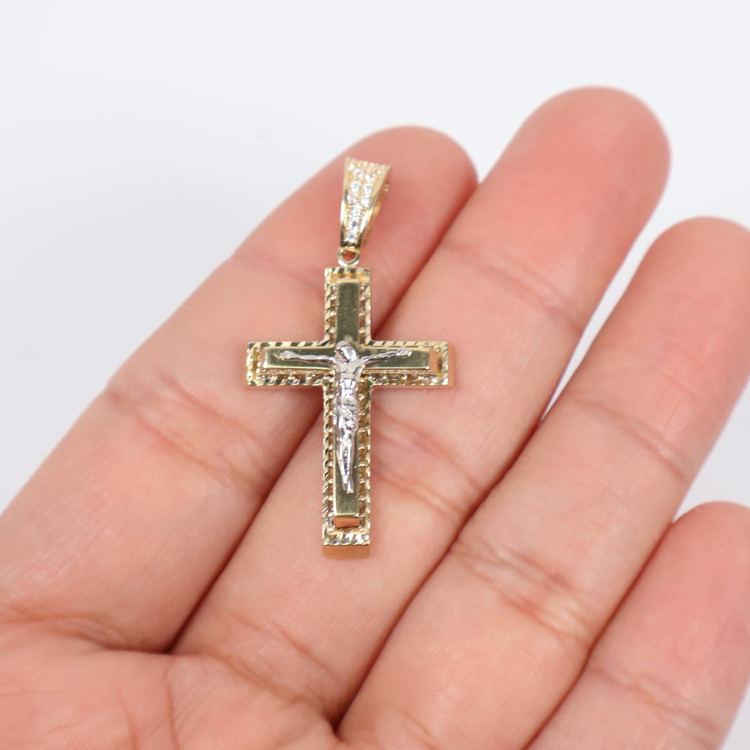 14K 2 Tone Crusifix Pendant / 4.55gr / 1.3in / White Zircons