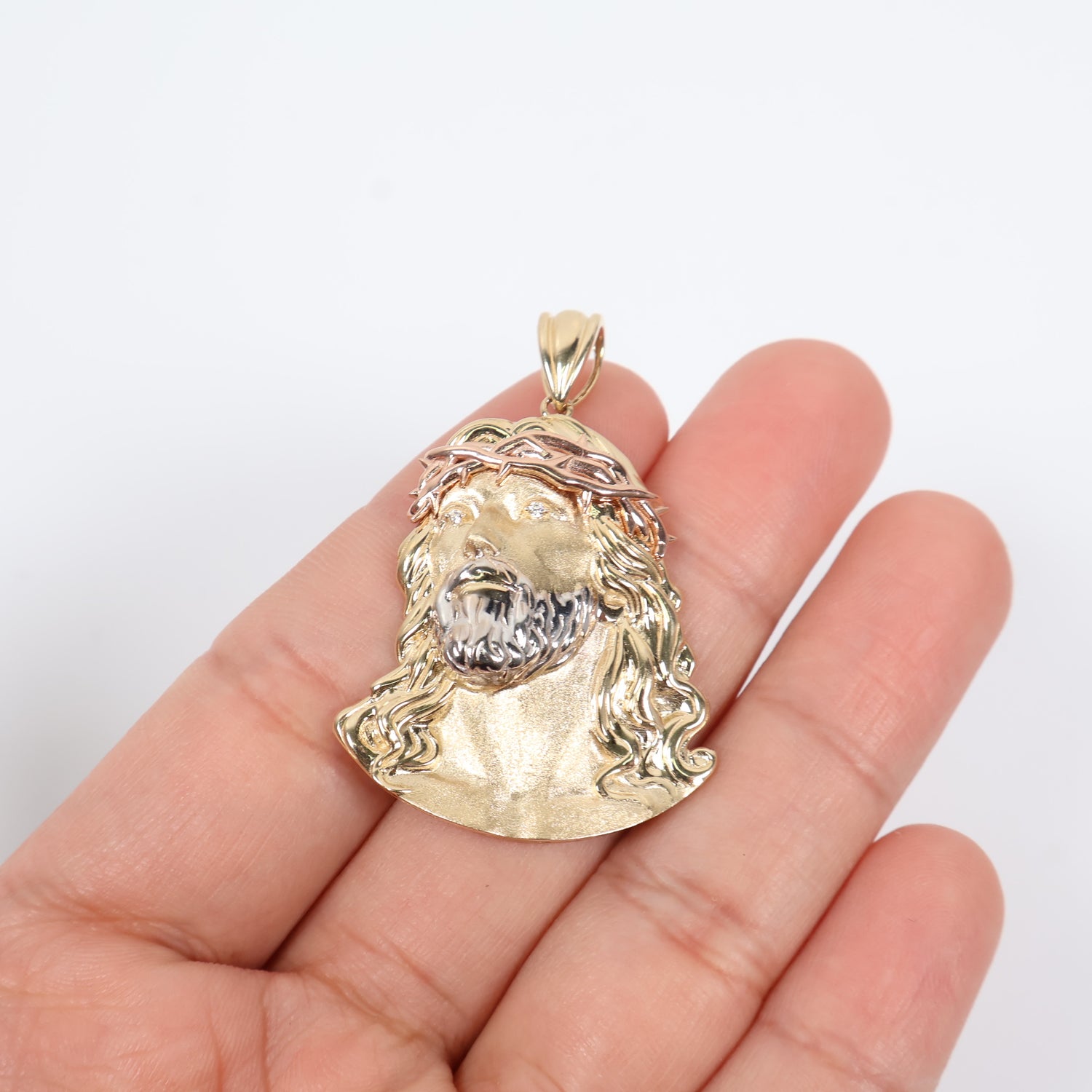 14K 3 Tone Big Jesus Face Pendant / 8.9gr / 1.6in / White Zircons