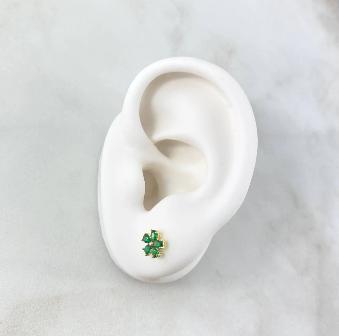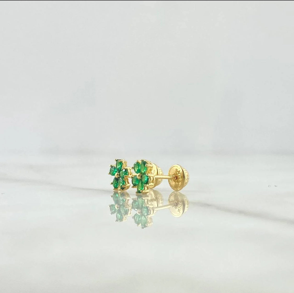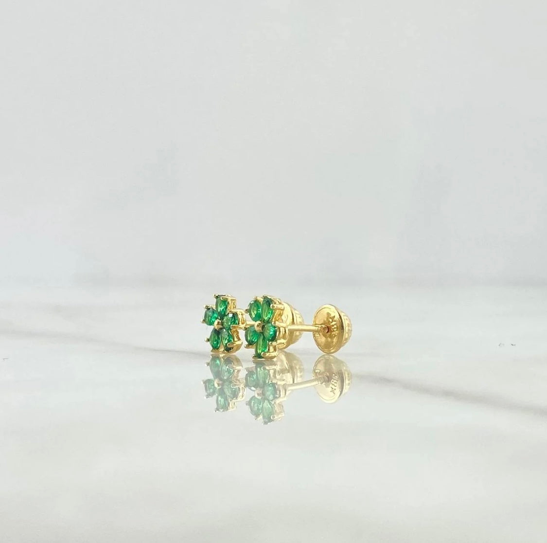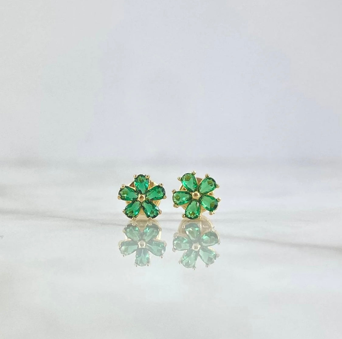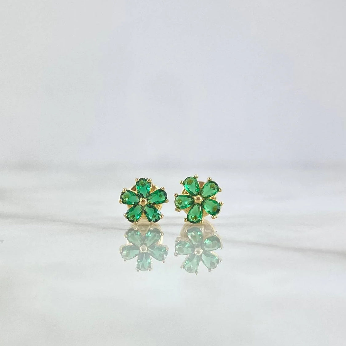 18K Yellow Gold Five Petal Flower Stud Earrings With Green Zircons / 1.12gr / 7mm
