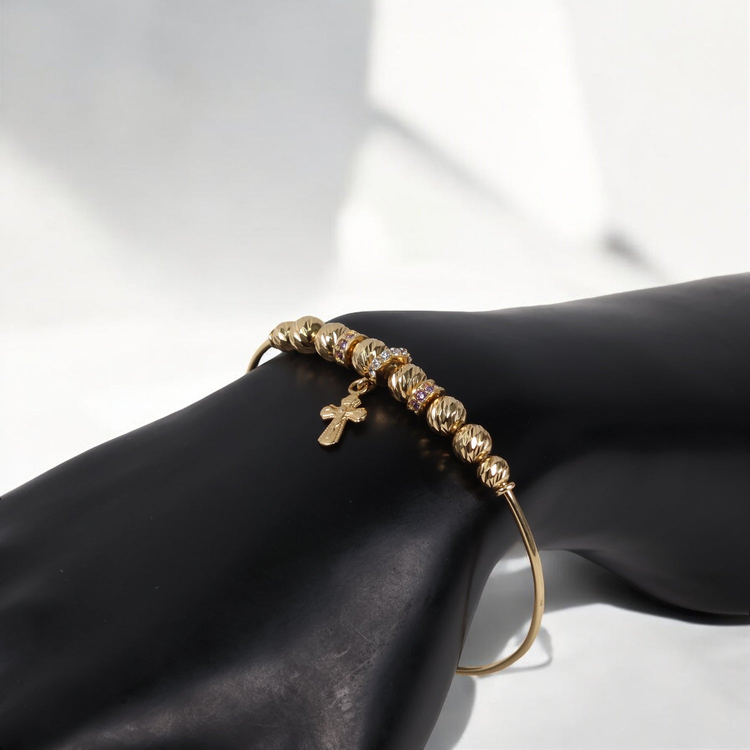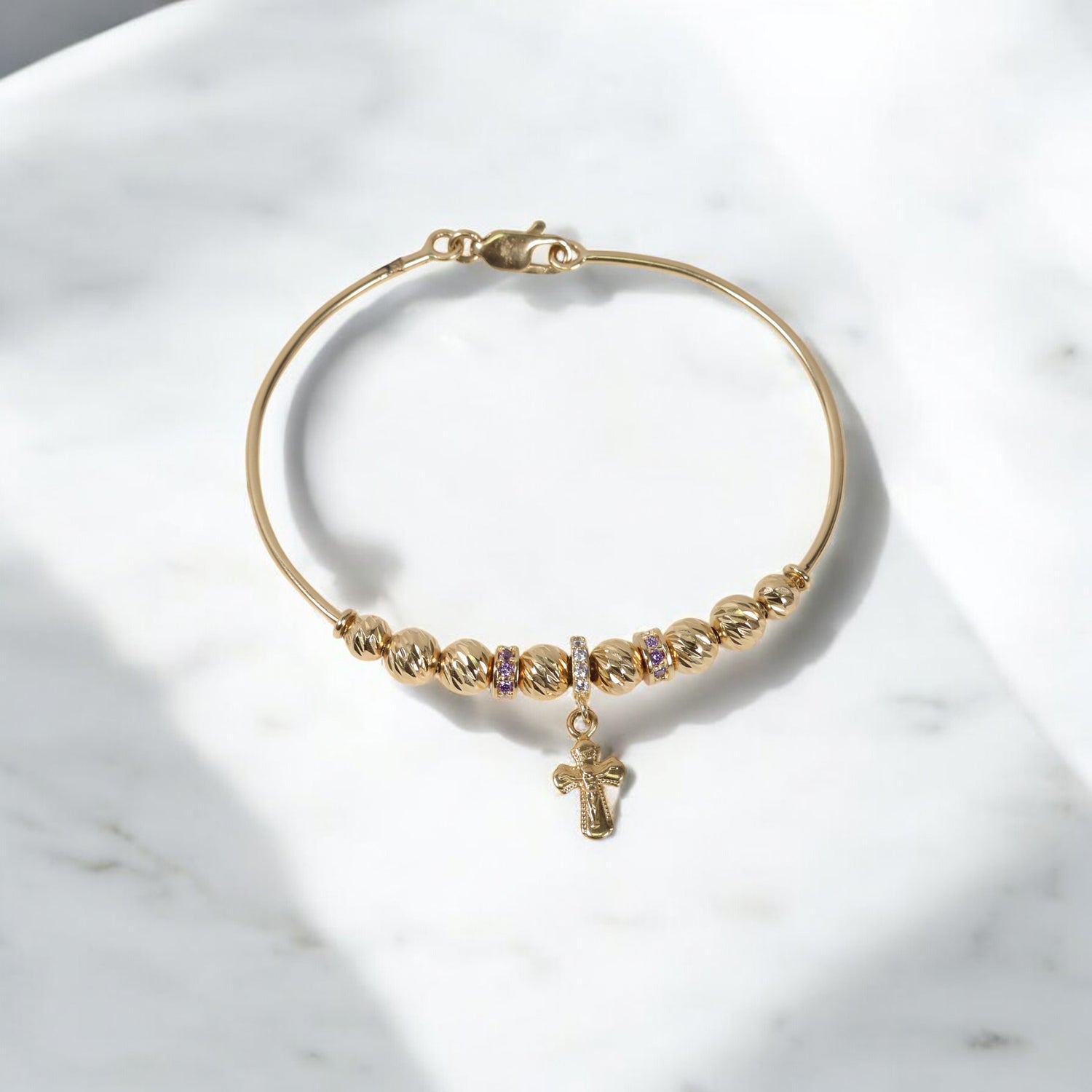 18K Yellow Gold Pd Cross Military Balls Diamond Cut Bracelet With Lila-White Zircons / 7.7gr / 5mm Y 6mm